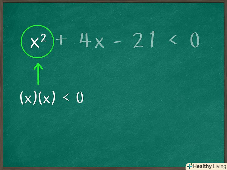 Знайдіть два числа, при перемноженні яких вийде третій член нерівності, записаного в стандартній формі.при цьому сума таких чисел повинна дорівнювати коефіцієнту при другому члені нерівності. Швидше за все, тут числа потрібно шукати методом проб і помилок, щоб вони задовольняли відразу двом описаним умовам. Зверніть увагу на знак («плюс» або «мінус»), який стоїть перед третім членом нерівності.- Наприклад: