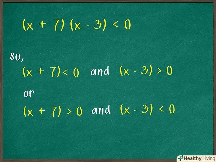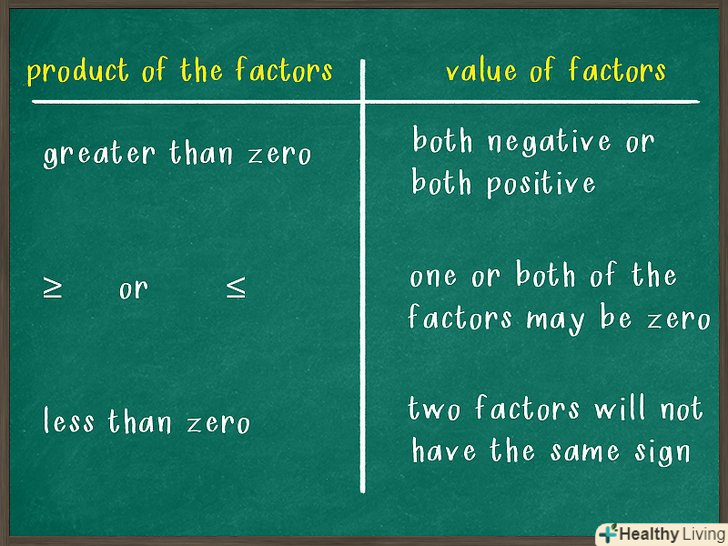 Визначте, чи мають обидва біноми однакові знаки. якщо твір біномів більше нуля, то обидва бінома будуть або негативними (менше 0), або позитивними (більше 0), тому що мінус на мінус дає плюс, і плюс на плюс теж дає плюс.[3]- Якщо нерівність більша або дорівнює нулю (