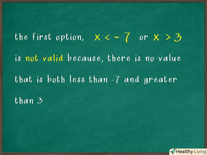Вирішіть дві нерівності другого варіанту. для цього ізолюйте зміннув кожному нерівність. Пам'ятайте, що якщо помножити або розділити обидві сторони нерівності на негативне число, знак нерівності змінюється на протилежний.[7]