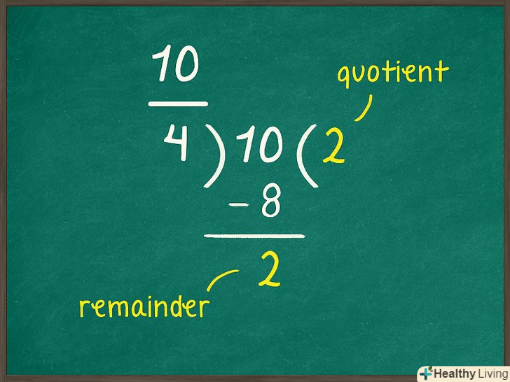 Розділіть чисельник на знаменник.Пам'ятайте, що Дробова риса позначає операцію ділення.[5] щоб спростити неправильну дріб, потрібно перетворити її в змішане число, яке включає ціле число і дріб. Ціла кількість разів, на яке чисельник ділиться на знаменник, являє собою цілу частину змішаного числа. Запишіть це число і зверніть увагу на залишок.- Знаменник не буде ділитися на чисельник без залишку, який являє собою дробову частину змішаного числа.