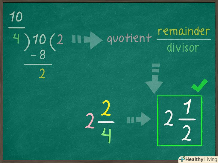 Спростіть відповідь, якщо необхідно.іноді дробову частину змішаного числа можна спростити, щоб отримати остаточну відповідь.[6]- У нашому прикладі змішане число