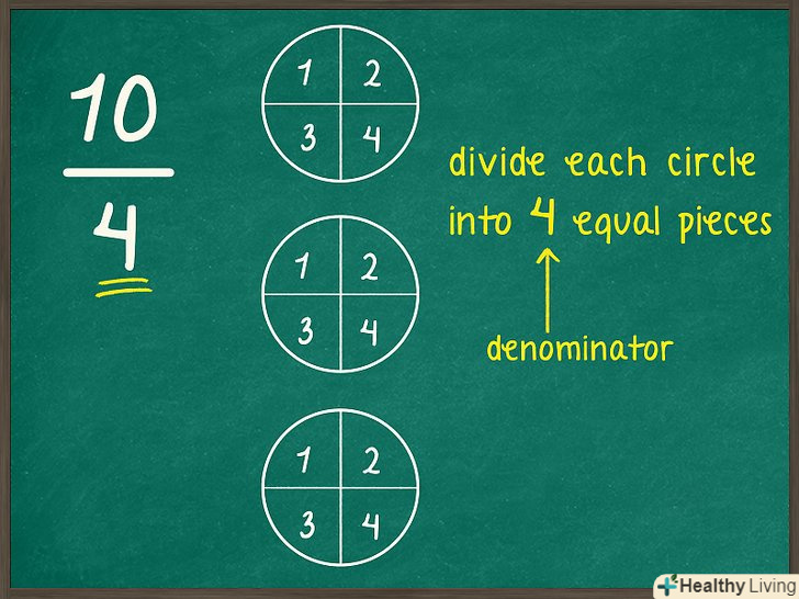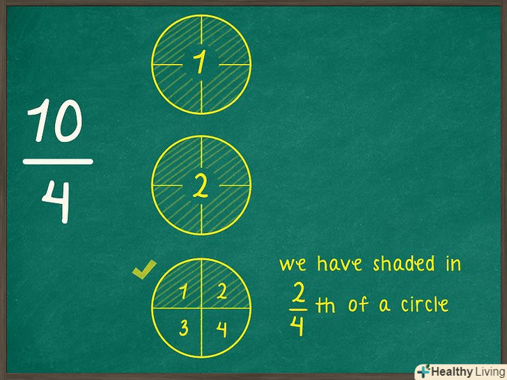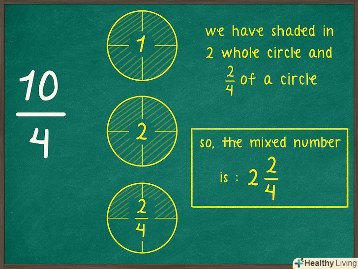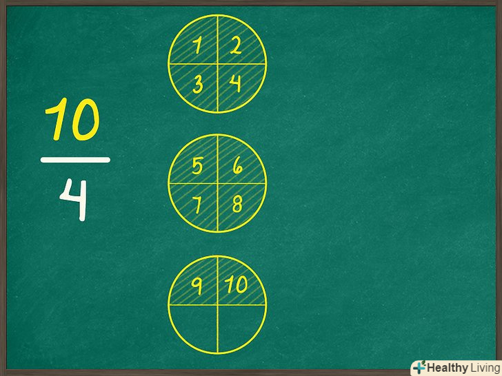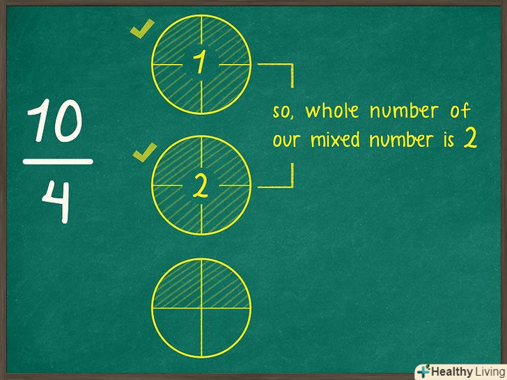Порахуйте, скільки повних кіл ви заштрихували. щоб спростити неправильну дріб, необхідно перетворити її в змішане число, яке включає як ціле число, так і дріб. Кількість повних заштрихованих кіл являє собою цілу частину змішаного числа.- Наприклад, у випадку дробу