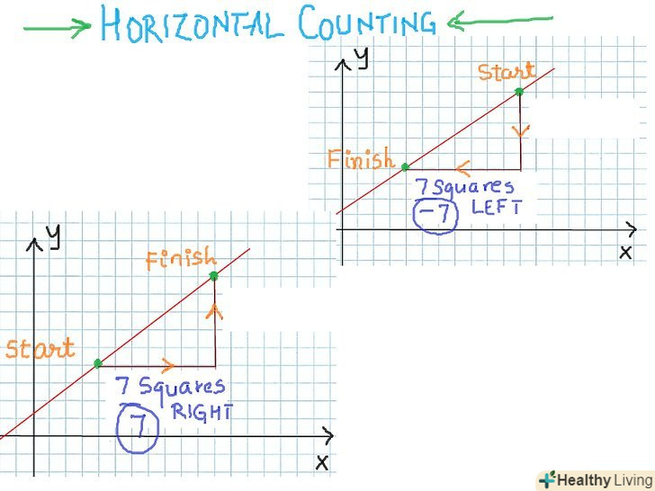 - Тепер виберіть точку, що лежить на графіку зліва, і знайдіть відстань між цією точкою (вихідна точка) і точкою перетину (кінцева точка) прямих, паралельних координатним осям. Тобто вам потрібно порахувати кількість поділок на осі Х від вихідної точки до кінцевої точки. Наприклад, кількість поділок дорівнює 7.