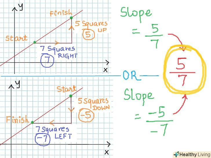 Кутовий коефіцієнт дорівнює відношенню кількості поділок на осі Y до кількості поділок на осі Х; в нашому прикладі кутовий коефіцієнт дорівнює 5/7.