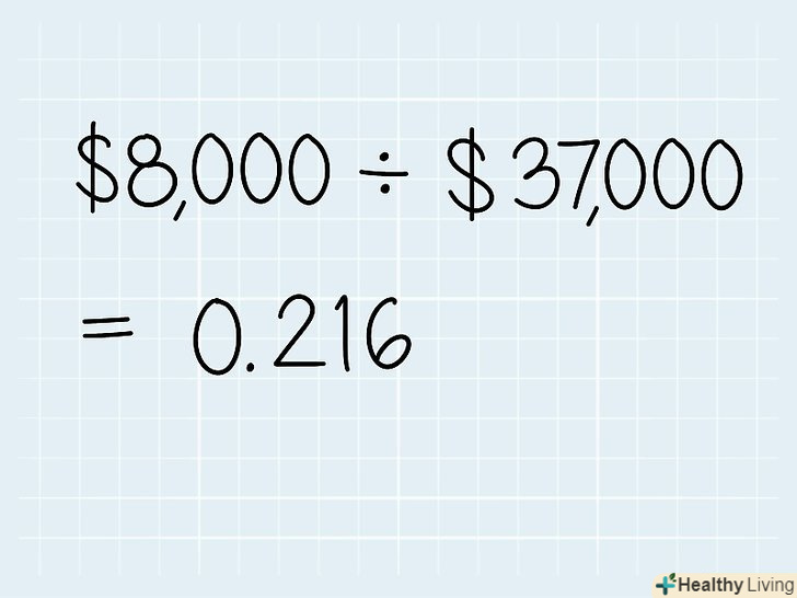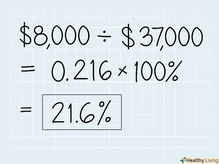 Розділіть отриманий результат на вихідне значення.знайшовши різницю між числами, розділіть її на вихідне значення, яке є меншим числом, якщо відсоток збільшився, або більшим числом, якщо відсоток зменшився.[2]- У нашому першому прикладі розділіть 80 000 (різниця між доходами) на 370 000 (вихідний дохід). Відповідь: 0,216.