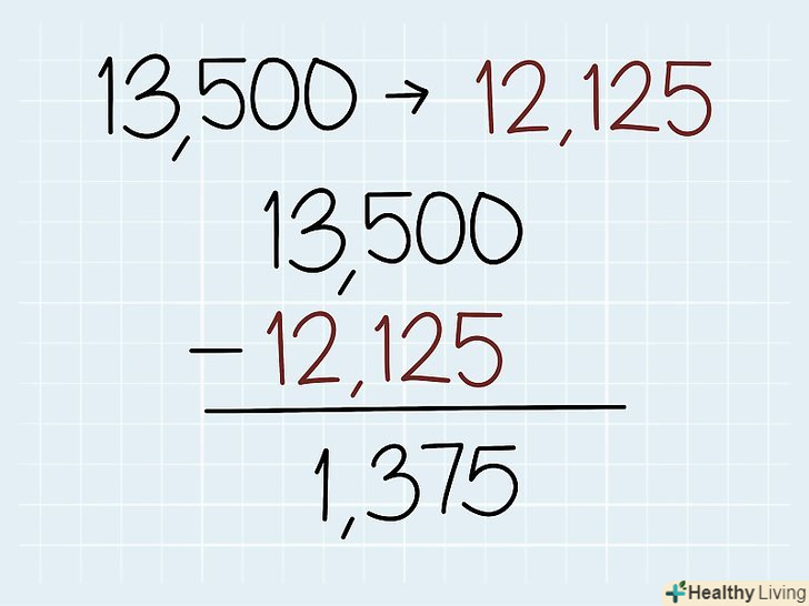 Відніміть нове значення зі старого.зробіть це, щоб обчислити процентне зменшення за вказаною формулою. Зверніть увагу, що в попередньому розділі ви віднімали старе значення з нового.[4]- Наприклад, обчислимо зміна числа школярів. Якщо цього року було 12 125 учнів, а минулого року їх було 13 500, відніміть 12 125 з 13 500 і отримайте 1375.