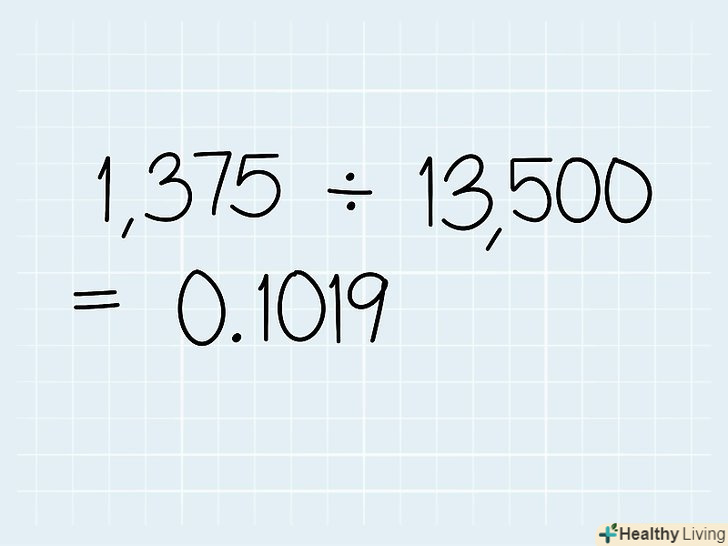 Розділіть отриманий результат на вихідне значення.Пам'ятайте, що при обчисленні процентного зменшення вихідним значенням є більше число.[5]- У нашому прикладі розділіть 1375 (результат віднімання) на 12 125 (вихідне значення). Відповідь: 0,1134.