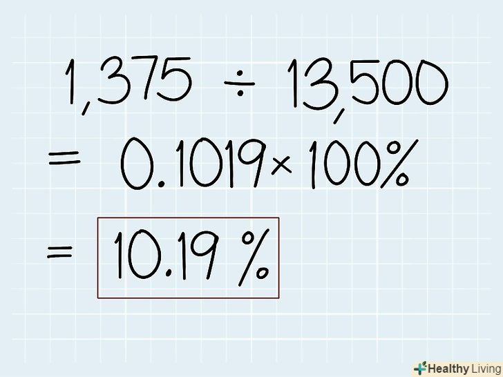 Помножте отриманий результат на 100.зробіть це, щоб перетворити результат у відсотки.[6]- Помножте 0,1134 на 100 і отримаєте 11,34. Таким чином, число школярів скоротилося на 11,34 %.
