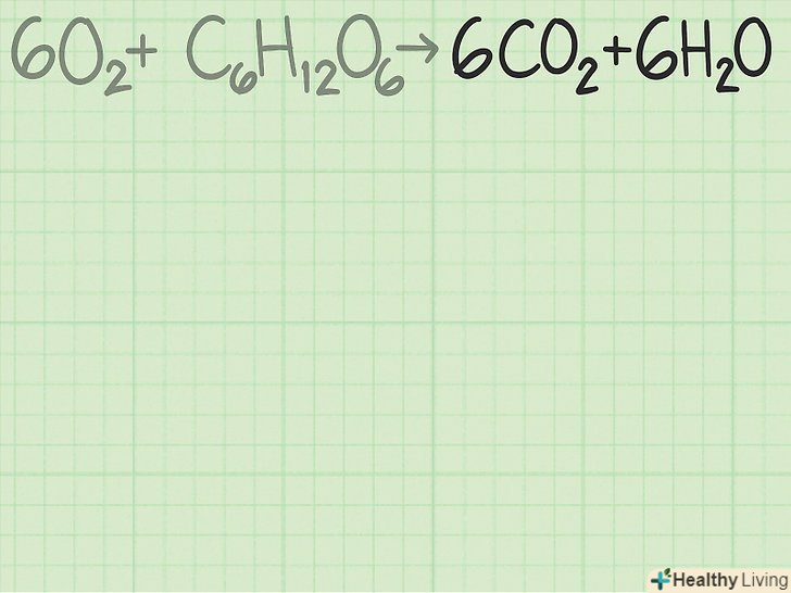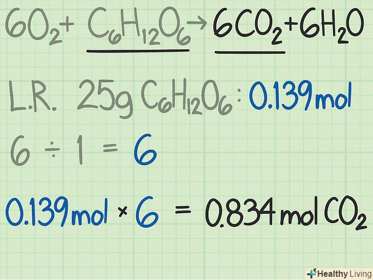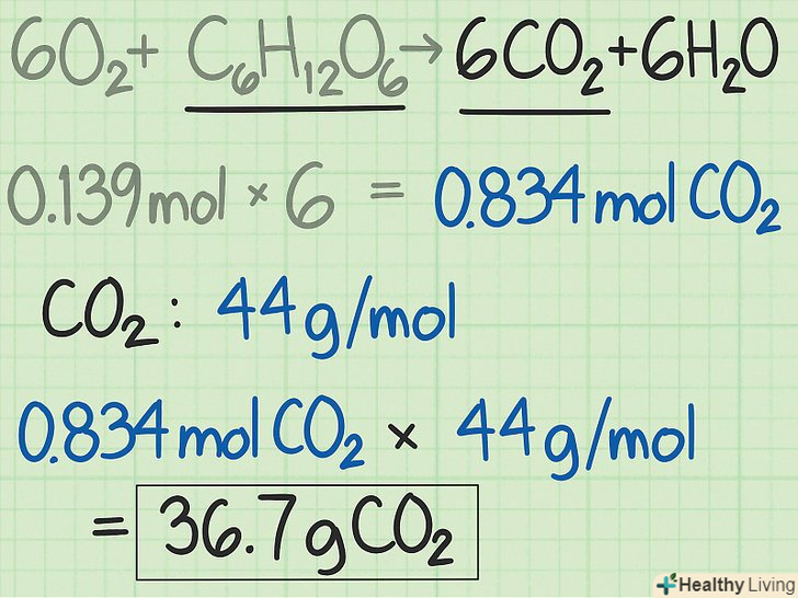 Розрахуйте молярні маси реагентів.за допомогою таблиці Менделєєва або довідника визначте молярні маси атомів всіх елементів, які входять в беруть участь в реакції з'єднання. Складіть їх, щоб визначити молярну масу кожного реагенту. Виконайте це для однієї молекули з'єднання. Розглянемо ще раз реакцію між киснем і глюкозою з утворенням вуглекислого газу і води:→