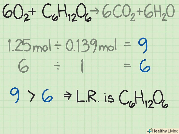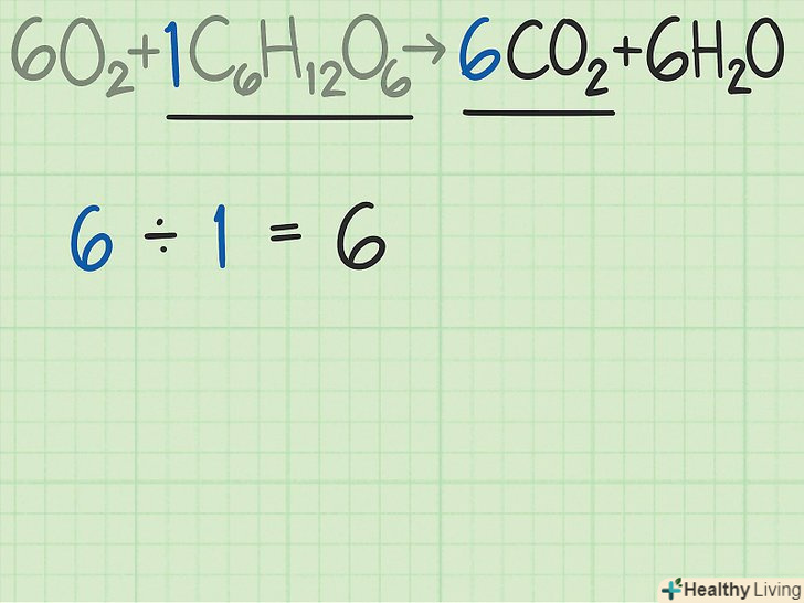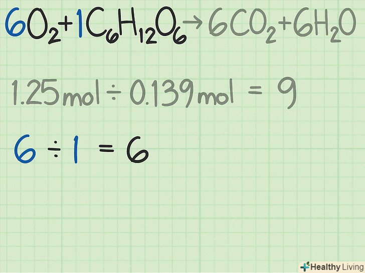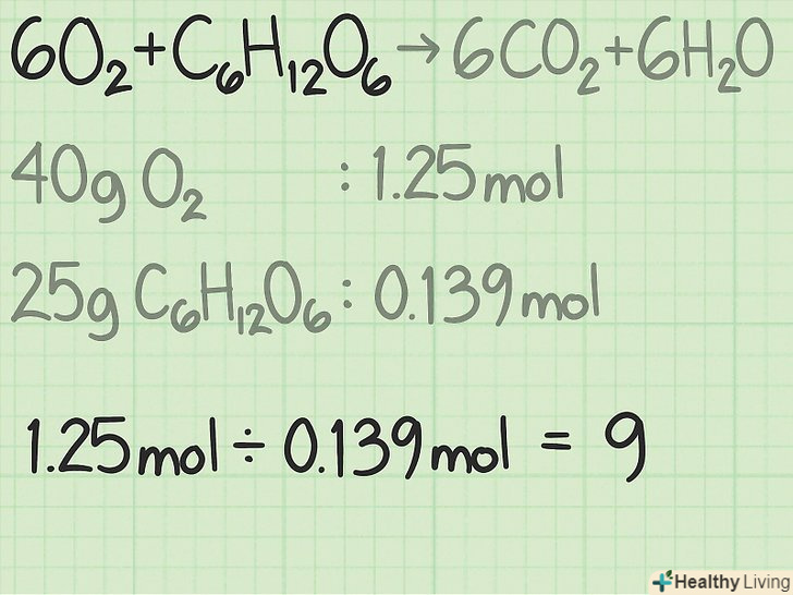 Визначте співвідношення реагентів.Моль використовується в хімії для того, щоб по масі речовини визначити кількість його молекул. Визначивши кількість молей кисню і глюкози, ви дізнаєтеся, скільки молекул кожної речовини вступає в реакцію. Щоб знайти співвідношення між двома реагентами, поділіть число молей одного реагенту на кількість молей іншого реагенту.[4]- У розглянутому прикладі на початку реакції є 1,25 моля кисню і 0,139 моля глюкози. Таким чином, відношення кількості молекул кисню до числа молекул глюкози становить 1,25 / 0,139 = 9,0. Це означає, що молекул кисню в 9 разів більше, ніж молекул глюкози.
