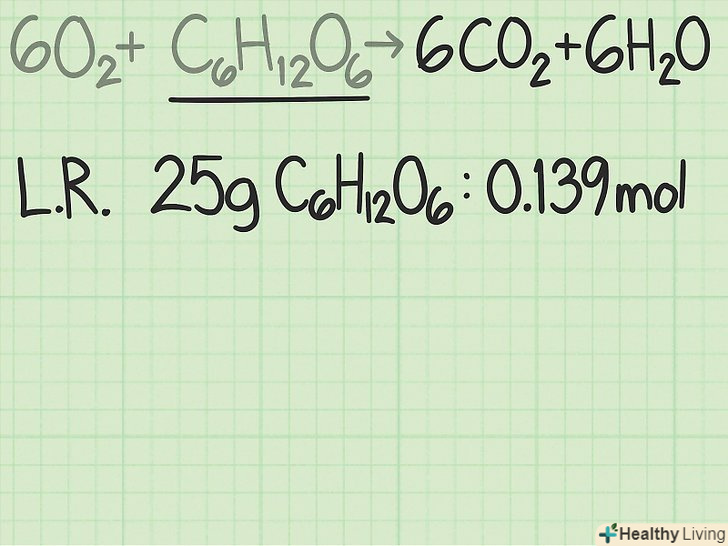 Переведіть кількість кожного реагенту з грамів в молі.у реальному експерименті відомі маси реагентів в грамах. Щоб перевести їх в кількість молей, поділіть масу кожного реагенту на його молярну масу.[3]- Припустимо, в реакцію вступають 40 грамів кисню і 25 грамів глюкози.