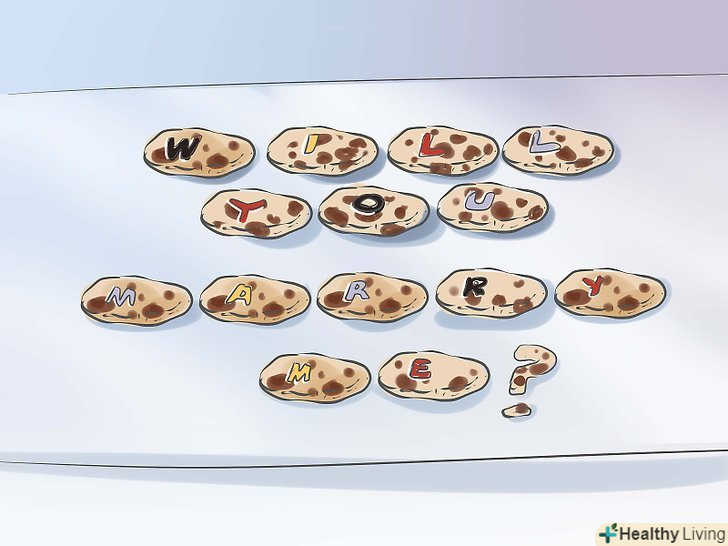 Зробіть пропозицію, пов'язану з їжею.багатьом сподобається хороша пропозиція, яка пов'язана з їжею (якщо він не з'їсть пропозицію випадково, в кінцевому підсумку!). Є багато способів використовувати Продукти харчування, щоб зробити веселим пропозицію руки і серця.- Є способи зробити персональне печиво з передбаченням. Ви могли б зробити таке, з написом: "Ти одружишся на мені?". і переконайтеся, що воно змішується, коли ви забираєте його (або, якщо ви зробите трохи прекрасної китайської їжі).
