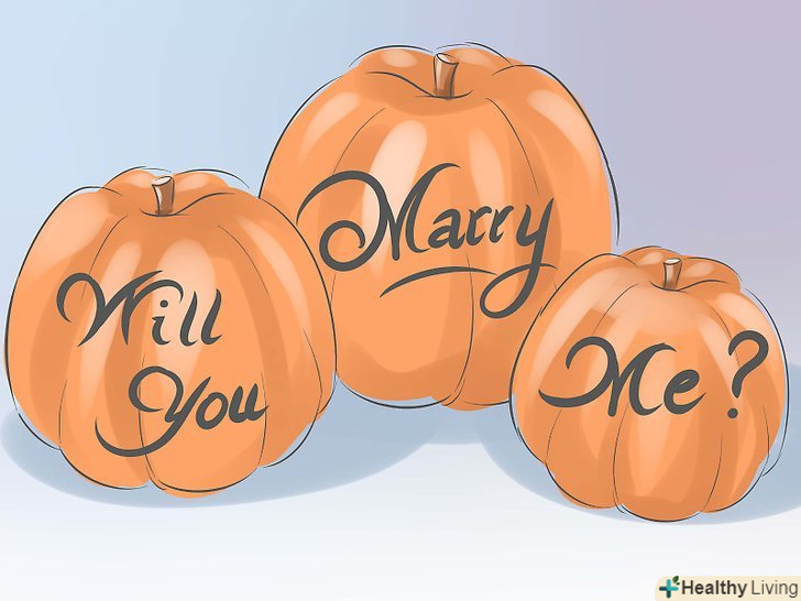 Зробіть пропозицію за допомогою різьблення на гарбузі.під час Хеллоуїна перейдіть до гарбузової галереї та зателефонуйте своєму хлопцю на конкурс вирізання гарбуза. У той час як він відволікається, виріжте: "Ти одружишся на мені?"на вашій гарбузі і покажіть йому, Коли ви обидва закінчите різьблення. Ви, ймовірно, виграєте конкурс тоді.