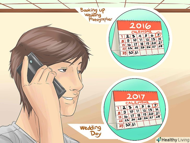 Починайте пошуки завчасно.домовитися з фотографом потрібно відразу ж після вибору і бронювання місця проведення заходу. Весільні фотографи користуються значним попитом, особливо в розпал весільного сезону, тому з кращими фотографами домовляються за рік до весілля.- Якщо ваше весілля відбудеться в незвичайний час або буде виїзна церемонія в неділю, то в даному випадку хорошого фотографа можна знайти і в більш короткий термін.