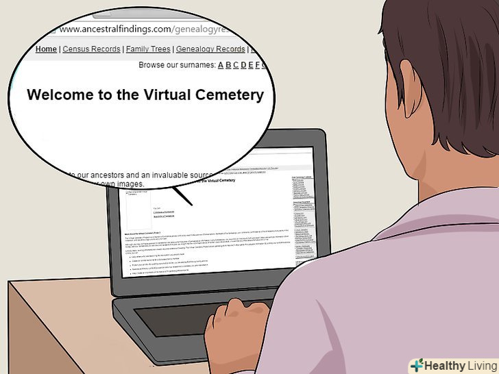 Скористайтеся генеалогією та сайтами віртуальних кладовищ.ці веб-сайти розроблені для того, щоб допомогти Вам дізнатися свою історію. З їх допомогою можна знайти могилу людини, і можливо вони навіть мають завантажені на сайт фотографії з місця поховання, так як багато людей присвячують себе документування кладовищ. Можете спробувати ввести в інтернет-пошуковик такі запити, як» знайти поховання«,» родовий Пошук «і»пошук кладовищ".[12][13]