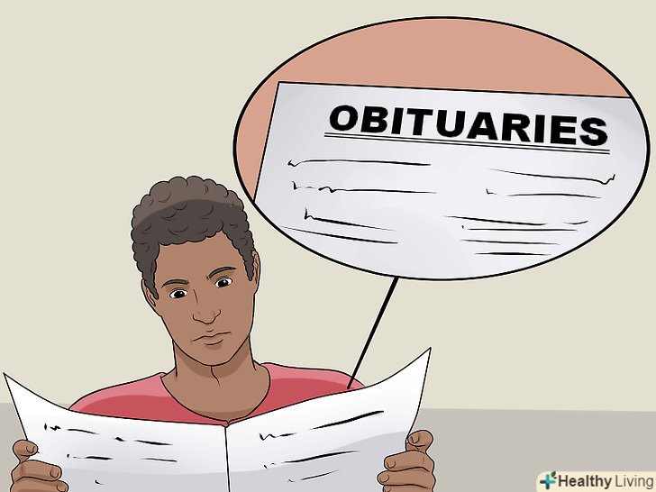 Знайдіть місце смерті.воно часто входить в некролог. Якщо вам відоме місто і країна проживання, ви також можете дізнатися і Регіон, назва якого запитують деякі сайти при пошуку подібної інформації. [5]- Якщо вам вдасться отримати копію свідоцтва про смерть, місце смерті також буде в ньому зазначено.[6]