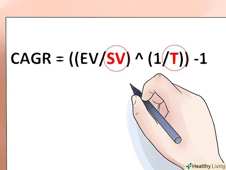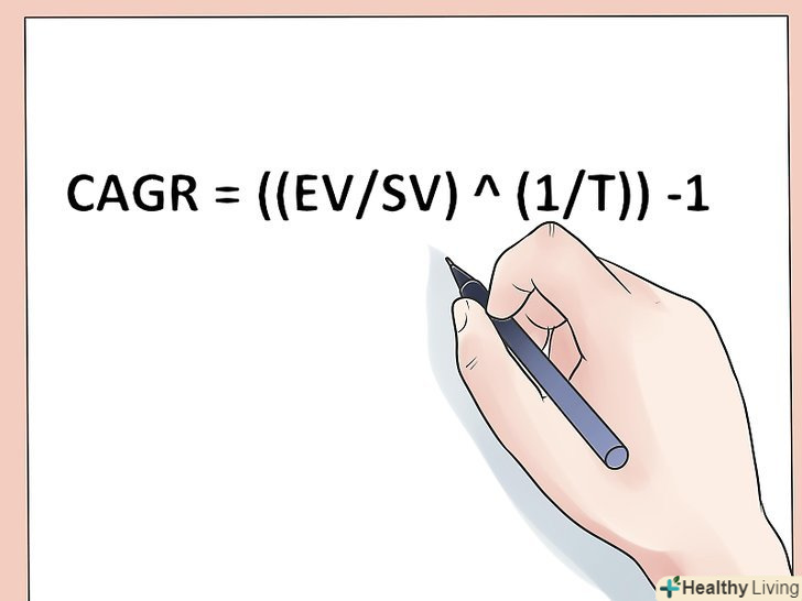 Подставьте данные значения в формулу: CAGR = ((EV/SV) ^ (1/T)) -1- Разновидностью данной формулы является следующая: CAGR = (FV - SV)/SV * 100