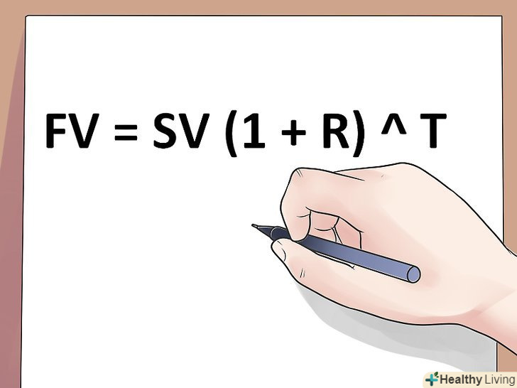 Рассчитайте будущую стоимость актива по формуле FV = SV (1 + R) ^ T.