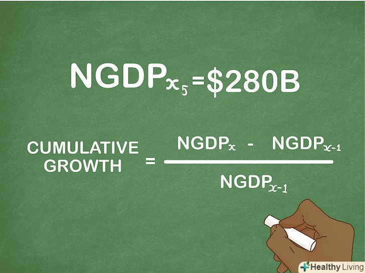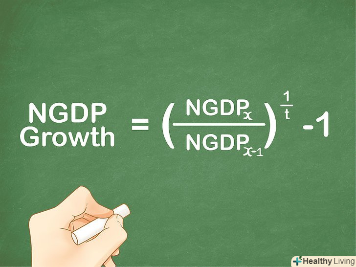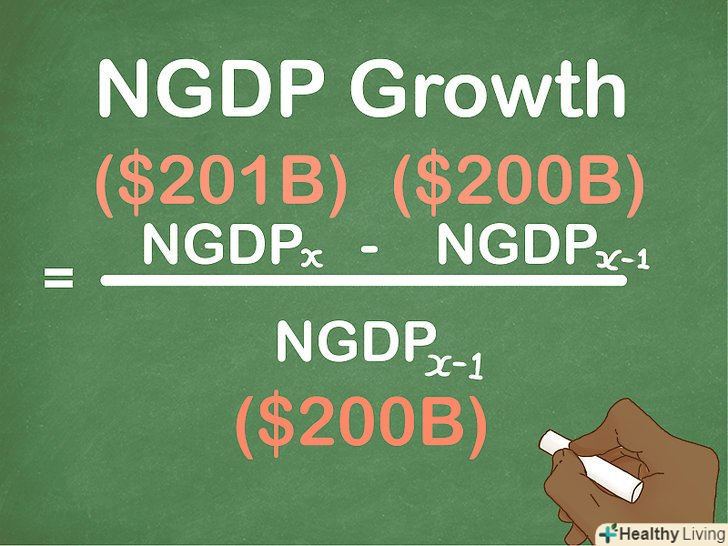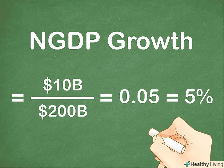 Обчисліть простий темп приросту номінального ВВП. просто зробіть віднімання і ділення за формулою, щоб отримати результат. Відповідь буде представлений десятковим коефіцієнтом приросту. Щоб висловити темп приросту в процентному вигляді, помножте коефіцієнт на 100 %.[7]- Слідуючи наведеному вище прикладу, перший етап рішення буде виглядати так: