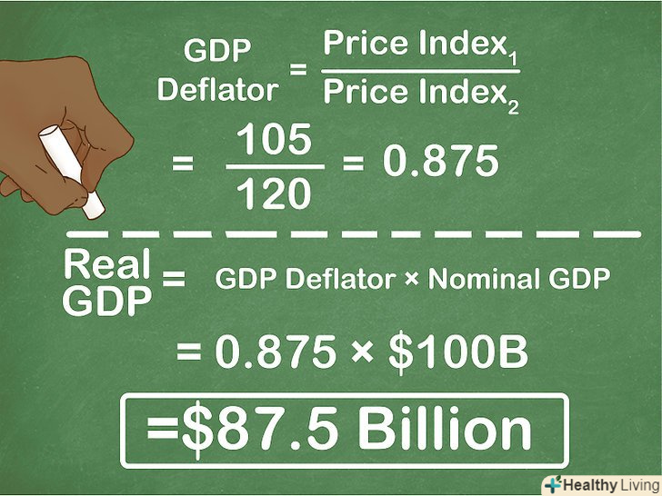 Конвертуйте приріст номінального ВВП в приріст реального ВВП.обчислення динаміки реального ВВП додає ще один крок до обчислення темпів приросту номінального ВВП, який виключає вплив інфляції або дефляції з цього показника. Для оцінки інфляції використовують дефлятор ВВП. Це коефіцієнт, що дозволяє привести показник номінального ВВП поточного періоду у відповідність з цінами базового періоду і тим самим отримати реальний ВВП. Дефлятор ВВП визначається співвідношенням індексів цін за двома порівнюваними періодами. Припустимо, що індекси-дефлятори за два роки становлять 105% в базовому році і 120% в поточному.[12]- В такому випадку темпи інфляції на основі значень дефлятора ВВП за базовий і поточний періоди розраховують наступним чином (за класичною формулою темпів приросту):