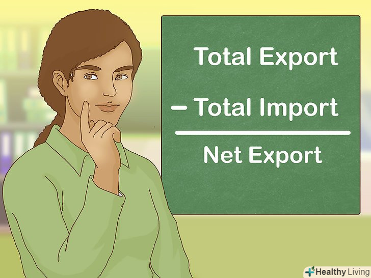 Розрахуйте чистий експорт.для цього обчислюють загальний обсяг експорту і загальний обсяг імпорту, після чого віднімають один з іншого. Різниця між сумою місцевих товарів, спожитих за межами країни, і сумою спожитих в країні імпортних товарів дозволяє визначити чистий експорт. Коли експорт перевищує імпорт, він збільшує ВВП. У зворотному випадку все відбувається навпаки.- Далі необхідно скласти всі чотири категорії витрат, щоб визначити номінальний ВВП за певний період часу.[5]