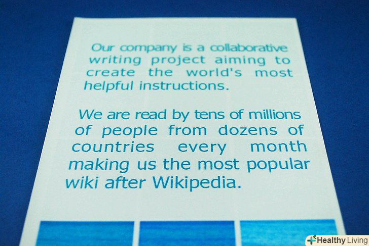 Сфокусуйтеся на одній думці.у буклеті повинна бути інформація про вашу компанію, але не занадто багато. Так, Загальні факти. Говоріть конкретно про те, що ви можете запропонувати потенційному покупцеві. [1].