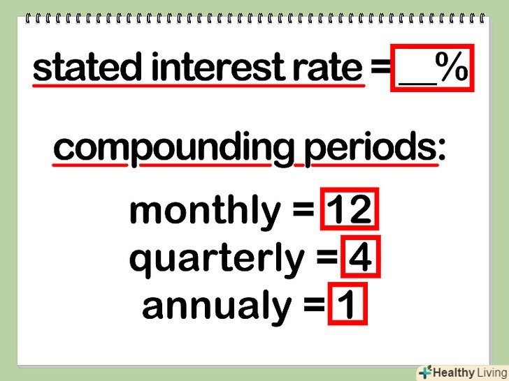 - Визначте кількість періодів нарахування відсотків за позикою.нарахування відсотків у році може бути щомісячним, щоквартальним, щорічним, безперервним або іншим. Це відноситься до того, як часто нараховуються відсотки.