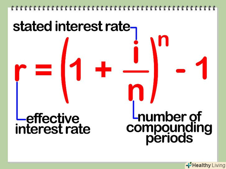 Формула для обчислення ефективної процентної ставки на основі номінальної процентної ставки.ефективна процентна ставка обчислюється за простою формулою: r = (1 + i/n)^n - 1.- У цій формулі: r-ефективна процентна ставка, i-номінальна процентна ставка, n-число періодів нарахування відсотків у році.