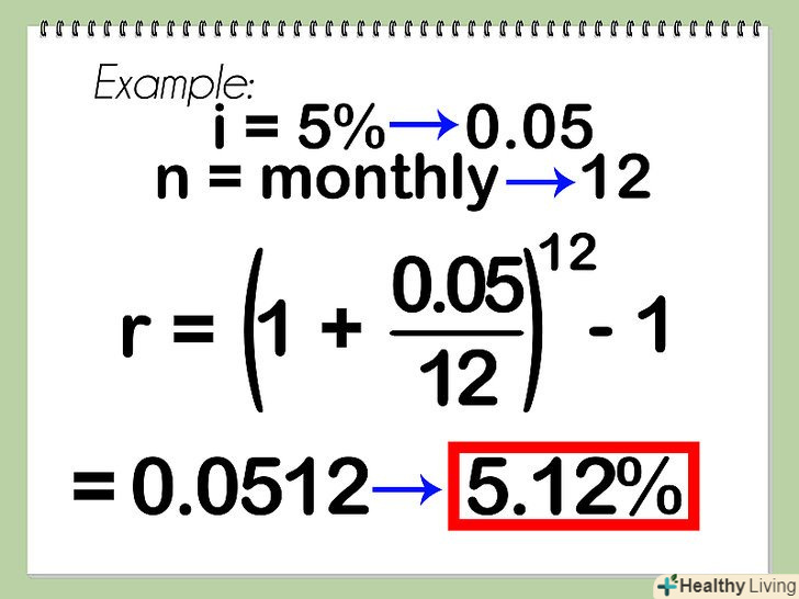 Приклад обчислення ефективної процентної ставки за наведеною вище формулою.наприклад, розглянемо кредит з номінальною процентною ставкою 5%, яка нараховується щомісяця. Згідно з формулою: r = (1+0,05/12)^12 - 1 = 5,12%. Якщо номінальна процентна ставка 5% нараховується щодня, то: r = (1+0,05/365)^365 - 1 = 5,13%. Зверніть увагу, що ефективна процентна ставка завжди більше, ніж номінальна ставка.