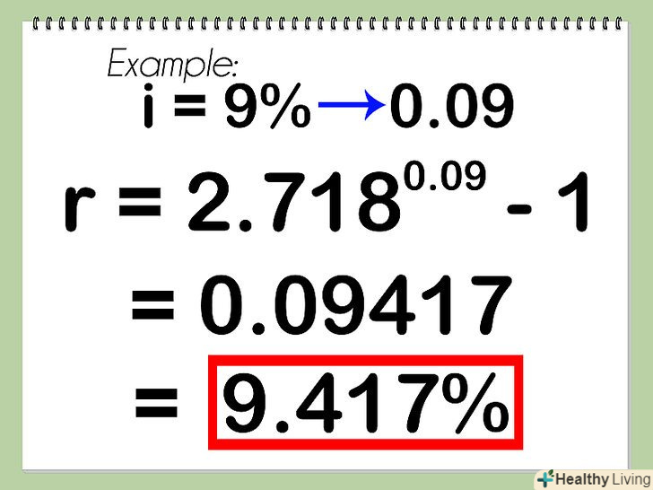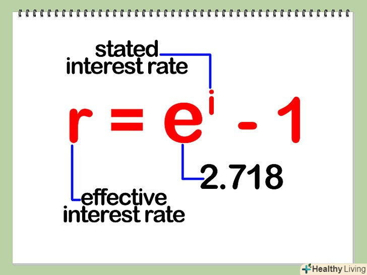Формула для обчислення ефективної процентної ставки, що нараховується безперервно.якщо відсотки нараховуються безперервно, то ви повинні обчислювати ефективну процентну ставку за іншою формулою: r = e^i - 1. У цій формулі r-ефективна процентна ставка, i-номінальна процентна ставка, е-постійна величина, рівна 2,718.