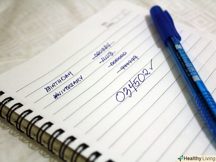 Виберіть не очевидний ПІН.Ваша дата народження, річниця весілля, номер телефону і домашню адресу-все це очевидний вибір, так що просто не використовуйте їх. Замість цього, подумайте про цифри, не пов'язані з основними подіями та адресами Вашого життя, щоб створити свій ПІН-код.[4]
