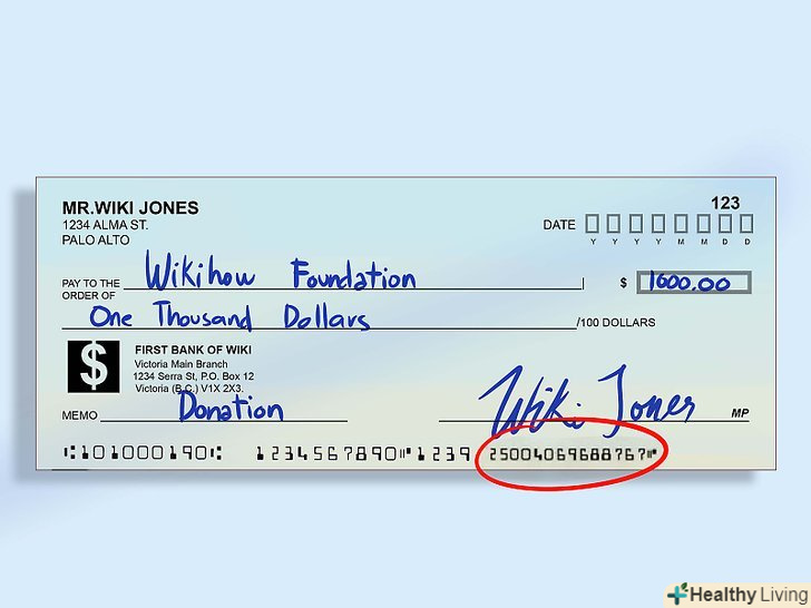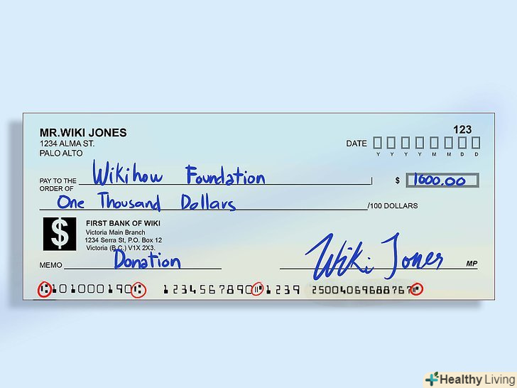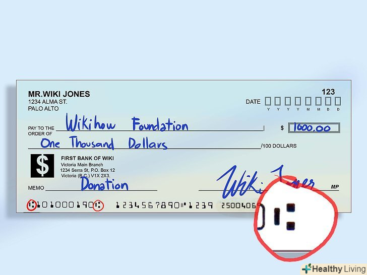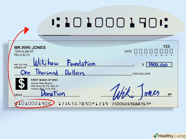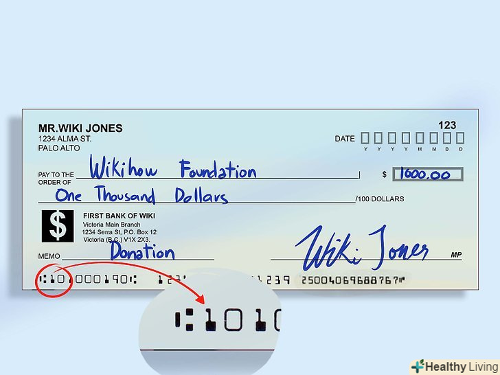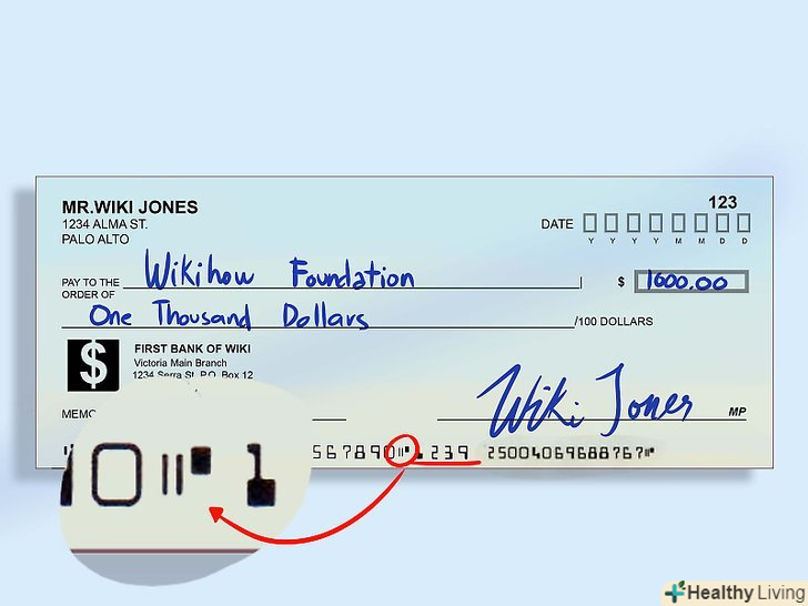 Зверніть увагу на невеликий значок.незважаючи на те, що найчастіше він є найпершим зліва, ця умова виконується не завжди (наприклад, на Офіційних банківських чеках). Іноді значок може розташовуватися всередині цифрового коду на MICR-лінії.- Будьте уважні і не сплутайте даний значок з символами номера чека і тире. Також, якщо ви коли-небудь працювали в банку, то напевно знаєте про значках в області для вказівки суми (правий нижній кут).