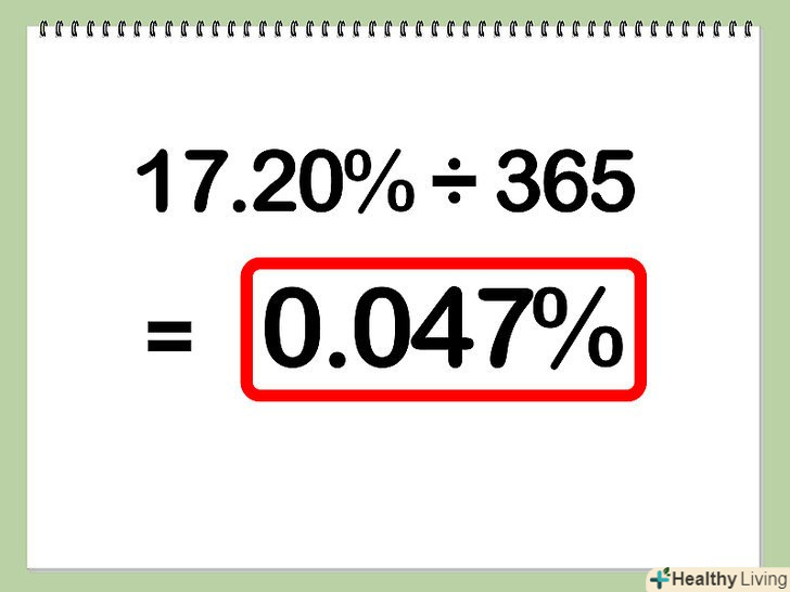 Розділіть річну ставку відсотка по вашій картці на 365, щоб отримати денну процентну ставку.