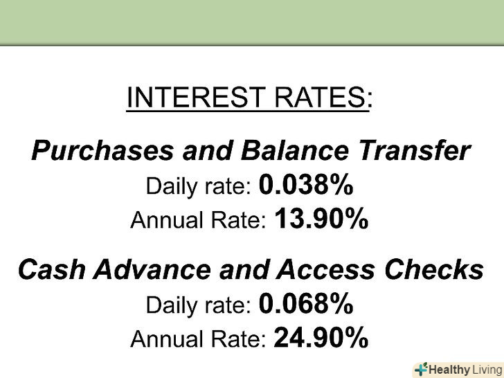 Якщо ви хочете порахувати, який відсоток ви платите за користування кредитною карткою або ж заплатите, якщо захочете скористатися карткою при покупці, спочатку вам потрібно ознайомитися з банківським договором, який Ви укладали при отриманні картки. Можливо, вам навіть доведеться повернутися до документа первинної організації, яка випустила карту, щоб дізнатися, як обчислюється відсоток для цієї конкретної картки. Відсоток по кредитній картці може нараховуватися щодня або щомісяця і може базуватися на будь-якому з видів балансів, включаючи середній денний баланс, двотактний середній денний баланс, кінцевий баланс, наведений баланс або попередній баланс.