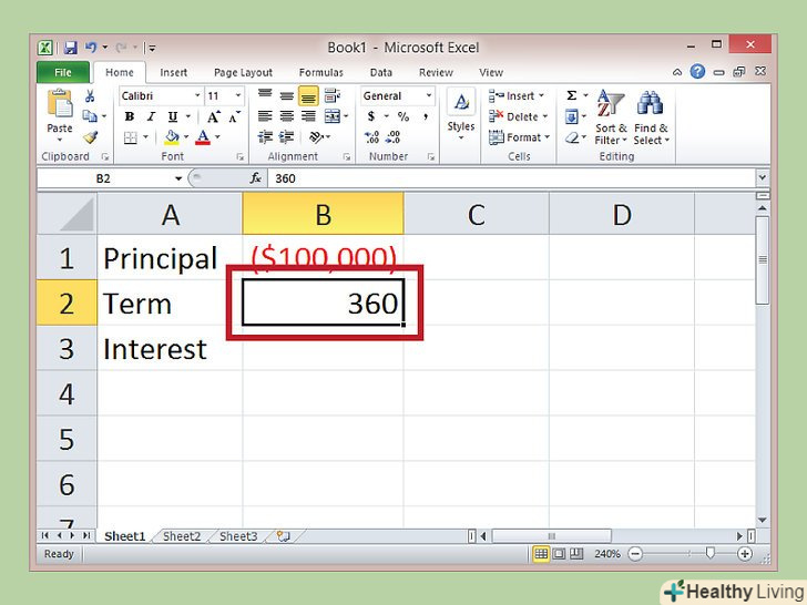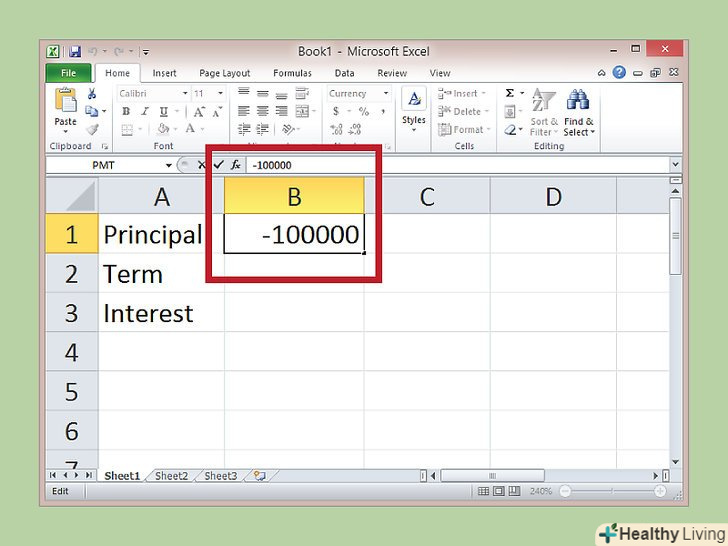 Введіть значення початкової суми позики з мінусом.програма Excel повинна сприймати цю цифру як вашу заборгованість. Для цього її слід зробити негативною і, крім мінуса і самих цифр, більше не вводити ніяких знаків, що позначають валюту.- -100000 — основна сума позики.