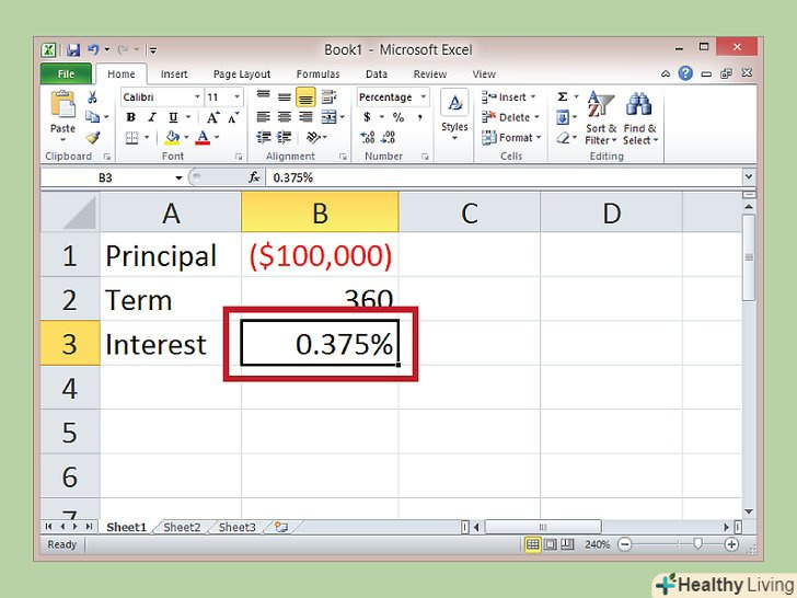 Конвертуйте процентну ставку відповідно до кількості виплат по кредиту в році.у розглянутому прикладі нам відома річна процентна ставка, яка може бути застосована до цілого року. Однак, виплати по кредиту повинні здійснюватися щомісяця, тому необхідно дізнатися щомісячну процентну ставку. Так як ставка 4,5% відповідає 12-ти місяців, просто поділіть її на 12, щоб обчислити значення місячної процентної ставки. Після закінчення обчислень не забудьте представити відсотки у вигляді десяткового дробу.- -100000 — основна сума позики.