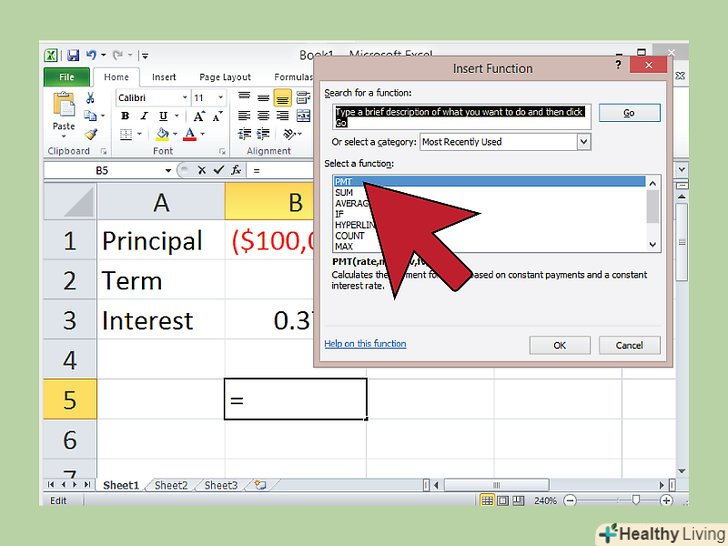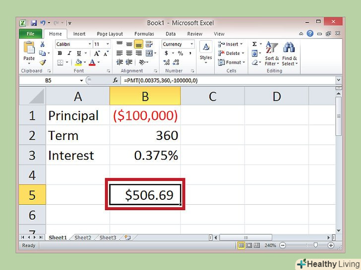 | 2 | з мінусом сума позики (-100000) | Загальна кількість платежів в місяцях (360) | річна процентна ставка у вигляді десяткового дробу (0,05) | Місячна процентна ставка (поділіть річну ставку на 12) |