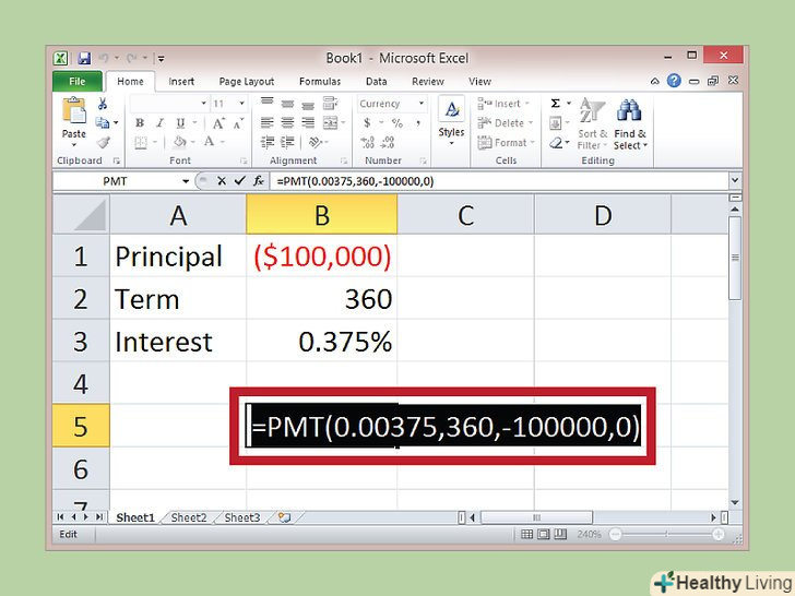 Введіть аргументи функції в правильному порядку.у дужках вкажіть дані, необхідні для здійснення розрахунку ануїтетних платежів, розділивши їх крапками з комою. У наведеному прикладі після назви функції вам необхідно ввести наступне: "(процентна ставка; кількість періодів; первісна сума позики; 0)".- Для зазначеного вище прикладу повний запис у комірці має виглядати так:" =ПЛТ(0,00375;360;-100000;0)".