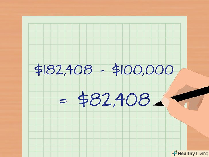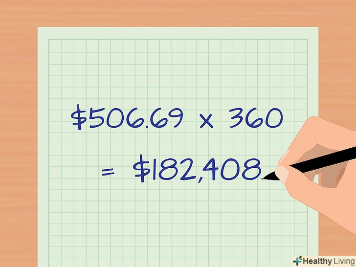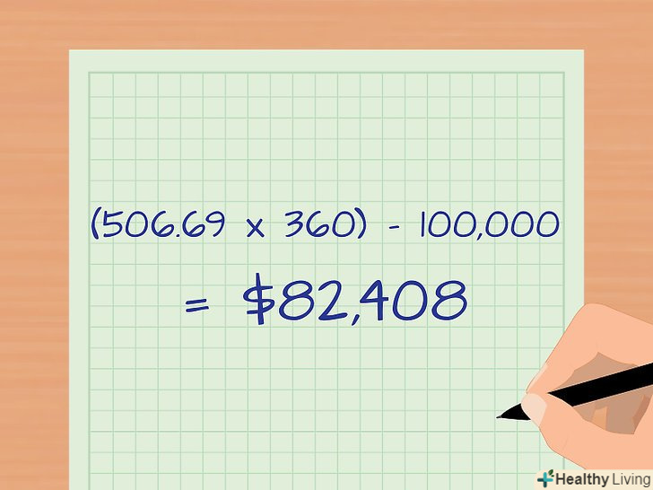 Обчисліть загальну суму відсотків по кредиту.тепер, коли вам відома сума щомісячних платежів, можна дізнатися суму відсотків, яку вам буде потрібно виплатити за весь термін користування кредитом. Помножте загальну кількість платежів на суму щомісячних виплат. Потім відніміть з результату первісну суму позики.[16]- Користуючись вищевказаним прикладом, вам слід помножити 506,69 на 360, і у вас вийде182408 рублів. Це загальна сума виплат по кредиту за весь його термін.