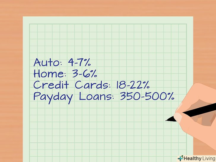 З'ясуйте процентну ставку по кредиту, перш ніж брати кредит.процентна ставка визначає вартість користування позиковими коштами. Вона ж лежить в основі розрахунку загальної суми відсотків, яку Ви сплатите кредитору за весь термін кредитування. Вам вигідно, щоб процентна ставка була якомога нижче. Навіть 0,5% різниці може представляти величезну суму в грошовому вираженні.[2] якщо ви віддаєте перевагу сплачувати менші суми по кредиту, ймовірно, вам буде потрібно збільшити термін кредитування, погодитися на більш високу процентну ставку (через підвищений ризик для кредитора) і заплатити більше відсотків, але тим самим зменшити фінансове навантаження на свій щомісячний бюджет. Такий варіант кредитування воліють люди з меншими заощадженнями і ті, чия зарплата сильно залежить від бонусів і комісійних. Проте, рекомендуємо вам постаратися знайти такий варіант кредитування, при якому процентна ставка по кредиту не буде перевищувати 10%. В даний час в Росії відсотки за різними видами кредитів, в середньому, коливаються в наступних межах:- Автокредит: 7-14% річних.[3]