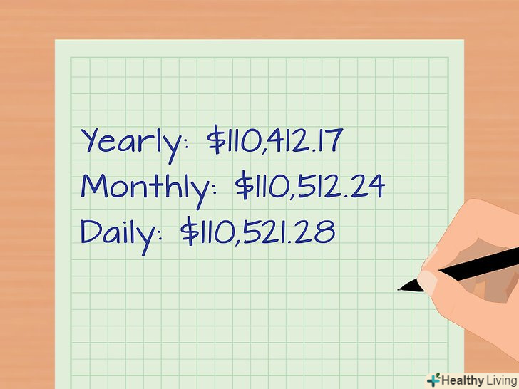 Дізнайтеся частоту нарахування відсотків по кредиту.з технічної точки зору, частота нарахування відсотків визначає розміри сплачуваних відсотків кредитору. Чим частіше нараховуються відсотки, тим більшу суму вам потрібно сплатити в результаті, так як у вас фактично буде менше часу на погашення відсотків і запобігання зростання їх суми.[9] наприклад, якщо ви взяли кредит на суму 100000 рублів за пільговою ставкою 4% річних, то загальна сума платежів по кредиту може виявитися різною при різній частоті нарахування відсотків:- При щорічному нарахуванні - 110412,17 руб.;