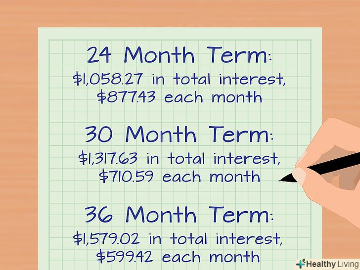 Використовуйте більш тривалі терміни позики, щоб щомісяця сплачувати менші суми, з урахуванням того, що в підсумку вам доведеться заплатити більше.термін позики визначає собою той період, протягом якого ви зобов'язуєтеся погасити кредит.[10] знову ж таки, терміни кредитування залежать від конкретних видів позик, і вам слід підібрати для себе такий варіант кредиту, де терміни погашення задовольнять вашим потребам. Якщо ви не впевнені в тому, що вам буде під силу виплачувати менш довгострокову позику з більш високою сумою щомісячних платежів, завжди можна підібрати більш тривалий кредит з меншими щомісячними платежами, але більшою їх підсумковою сумою. Більш тривалий термін кредитування зазвичай означає збільшення загальної суми сплачуваних відсотків, але дозволяє знизити щомісячні платежі по кредиту.[11] припустимо, що ви берете автокредит в розмірі 200000 рублів під 5% річних. Величина щомісячних ануїтетних платежів при різних термінах кредитування буде наступною:- При кредиті строком на 24 місяці ви заплатите всього 10583 рублів відсотків, але при цьому будете виплачувати банку щомісяця по 8744 руб;