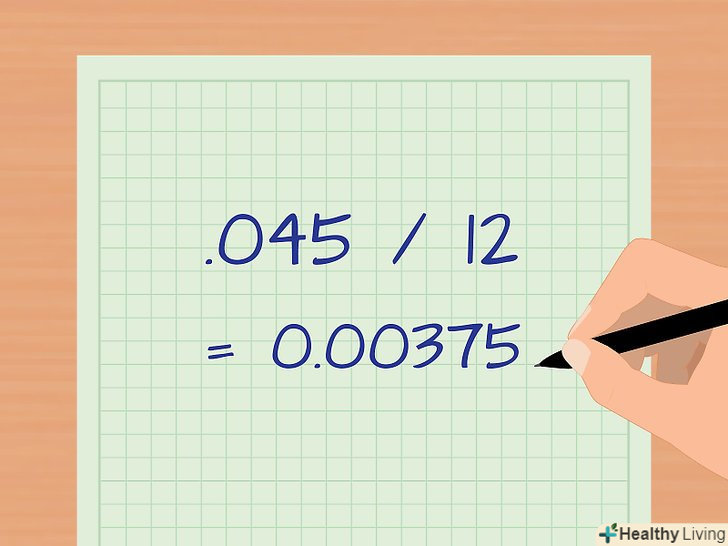 - Так як ви здійснюєте платежі по кредиту щомісяця, вам необхідно поділити річну процентну ставку на 12. Якщо 4,5% (або 0,045 в десятковому вигляді) розділити на 12, у вас вийде 0,00375. Це значення необхідно підставити в формулу замість "i".[14]