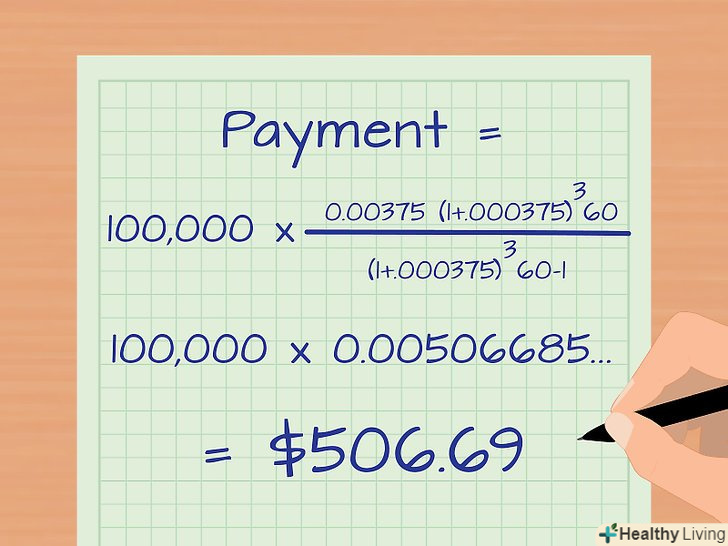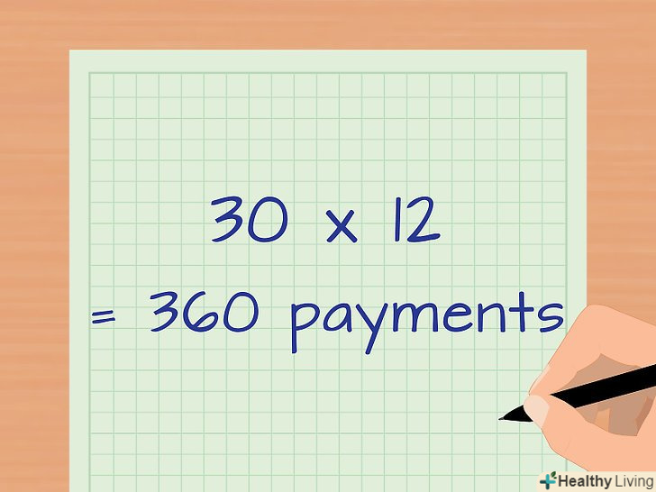 Визначте загальну кількість платежів по кредиту.щоб з'ясувати, яке число підставити в формулу замість "n", необхідно розрахувати загальну кількість платежів по кредиту, яке вам буде потрібно здійснити за весь термін кредитування.- Припустимо, що ви повинні щомісяця виплачувати кредит протягом 30 років. Щоб визначити загальну кількість платежів по кредиту, просто помножте 30 на 12. У вас вийде 360 платежів.[15]