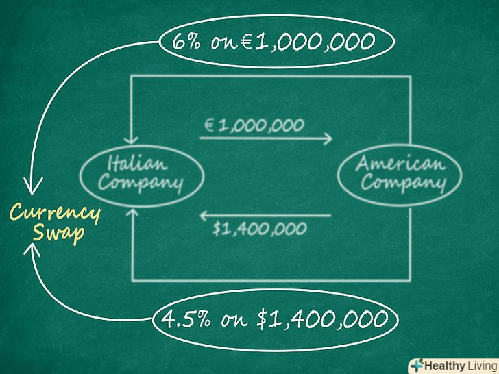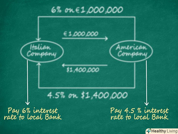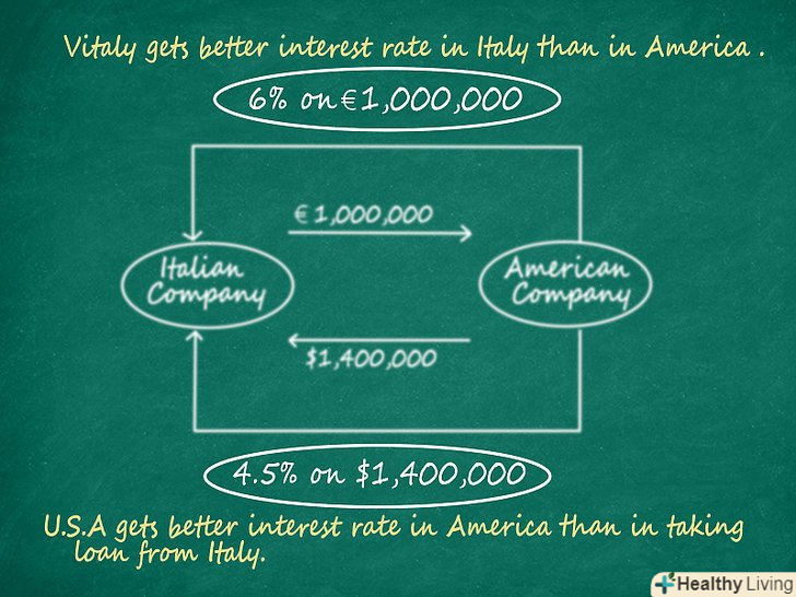 Використовуйте валютні своп-операції, якщо ви отримуєте кращі процентні ставки вдома, ніж закордоном.чому краще вибирати валютні операції замість просто покупки іноземної валюти? Операції з обміну валюти передбачають дві сторони. Згадаймо Віталія і компанію Brand USA. Віталій отримує кращу процентну ставку по позиці розміром в 1,000,000 € в Італії, ніж якби він взяв позику в Америці. Аналогічно і Brand USA, яка отримує кращу процентну ставку за позикою в 1,400,000 $ в Америці, ніж якщо б вона взяла кредит в Італії. Погоджуючись на обмін платежів за процентними ставками, валютні своп-операції об'єднують дві сторони, кожна з яких має більш вигідні угоди на надання позики в різних країнах, що передбачає використання різних валют.[2]