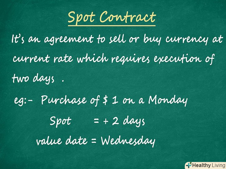 Купуйте спотові контракти.спотовий контракт-це договір на купівлю або продаж іноземної валюти за поточним курсом, який необхідно виконати протягом двох днів. Спотові контракти кардинально відрізняються від форвардних договорів, де всі істотні умови узгоджуються задовго до того, як активи або товари будуть передані, якщо взагалі передбачається їх передача.