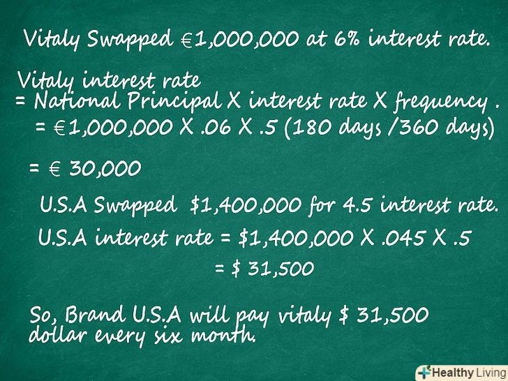 Підрахуйте вашу процентну ставку по платежу.відсоток по платежах, як правило, змінюється в межах від 6 місяців до 1 року, в цьому проміжку сторони переводять валюту на рахунок, що дозволяє їм застрахуватися від коливання їх власної валюти. Давайте розглянемо наступний приклад:- Віталій погодився укласти своп-операцію з продажу Brand USA 1,000,000 € з процентною ставкою 6% за 1,400,000 $ з процентною ставкою 4.5%. Давайте підрахуємо процентну ставку, яка буде обмінюватися кожні 6 місяців.