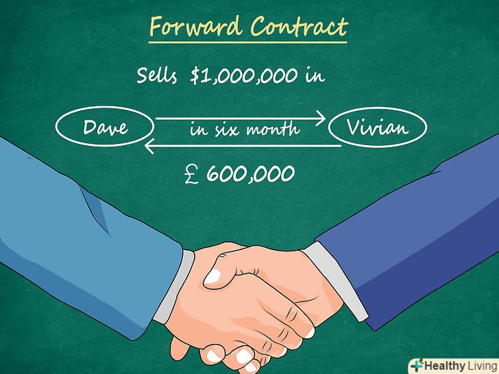 - Дейв пропонує Вівіан продати 1,000,000 $ американської валюти за 600,000 £ британської валюти через 6 місяців. Вівіан погоджується на угоду. Це і є форвардний контракт.