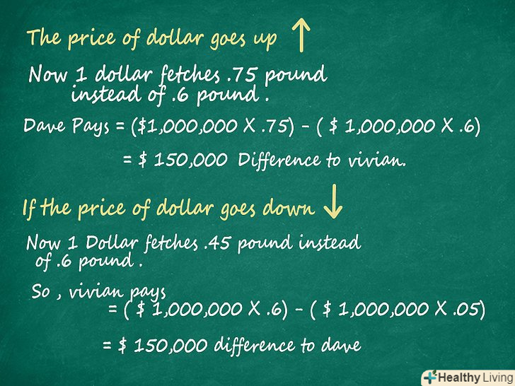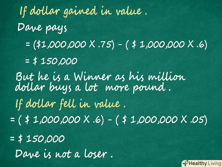 Використовуйте форвардні контракти як спосіб застрахуватися від падінь і різких стрибків на валютному ринку. як будь-який похідний фінансовий інструмент, форвардний контракт-це відмінний спосіб гарантувати, що ви не втратите велику суму грошей, якщо валюта, яка у вас є і має значні позиції, втратить свою цінність. Ось як Дейв опинився у виграші, використовуючи форвардний контракт:- Якщо долар виріс в ціні, Дейв у виграші, хоча він все ще повинен виплатити обумовлену суму. Якщо один долар коштує 0.75 фунта замість 0.6, то Дейв повинен заплатити Вівіан 150,000$, але за його один мільйон доларів тепер вже можна купити набагато більше фунтів.