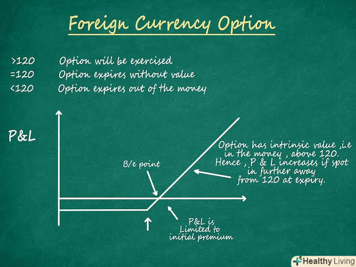 Купуйте валютні опціони.валютні опціони дають можливість купувати або продавати іноземну валюту, обумовлюючи конкретну ціну на конкретну дату. Цей спосіб хеджування схожий на форвардні контракти, за винятком того, що власнику опціону не потрібно здійснювати ніяких дій.- Коли настане обумовлена контрактом дата (дата закінчення терміну контракту), тоді покупець за договором може реалізувати опціон за узгодженою ціною (відома як ціна реалізації опціону), якщо коливання курсів валют зробить це вигідним. Якщо ж флуктуація (коливання курсу валют) так вплине на опціон, що він втратить свою цінність, то він припиняє свою дію без його реалізації з боку юридичної або фізичної особи.